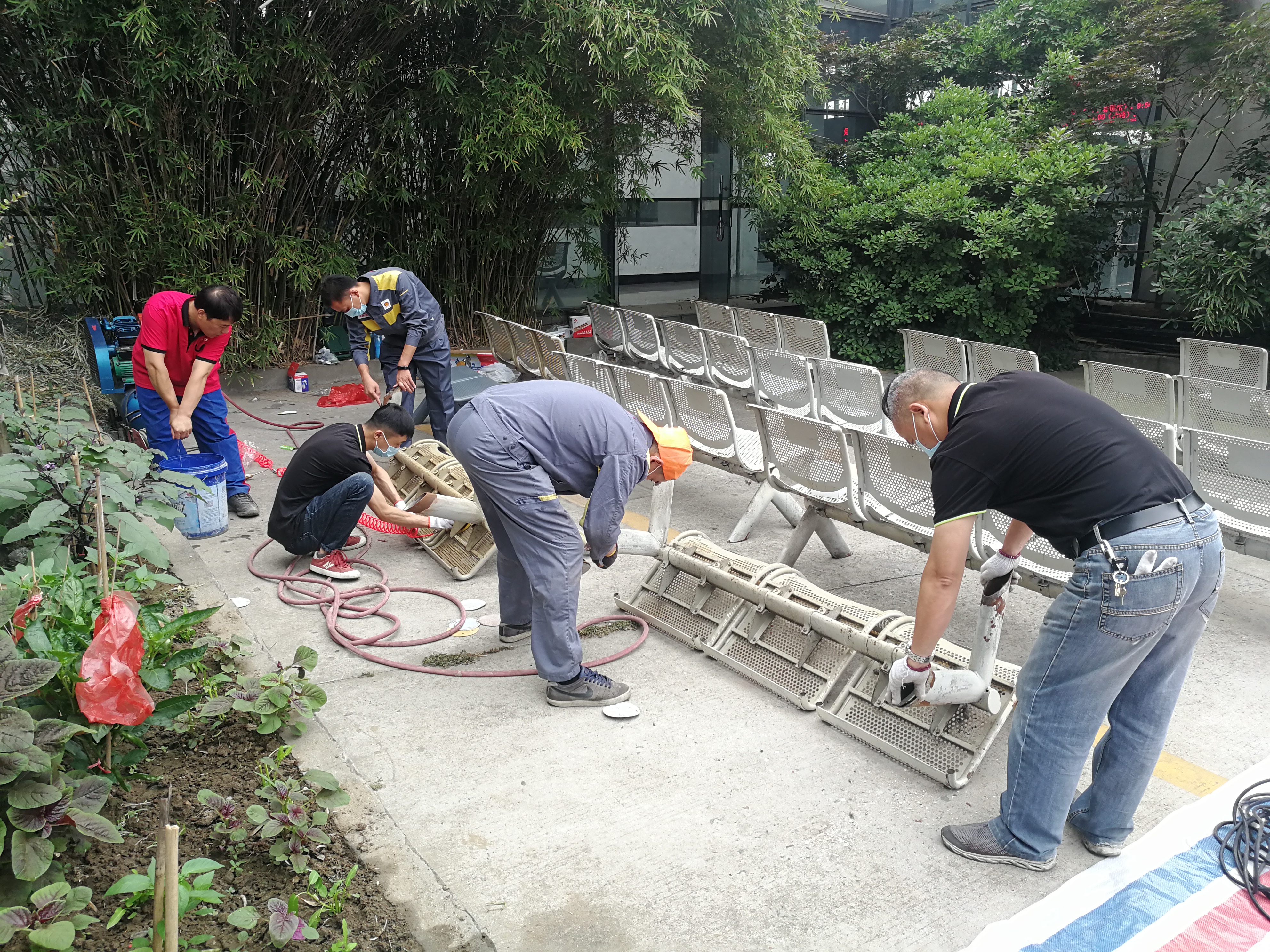 修理廠在接到江都分公司的任務請援,指派江都維修點,抽調(diào)總廠黨員骨干成立12人的突擊隊執(zhí)行這項任務。5月31日至6月1日兩天,從早上7點到晚上7點,突擊隊按照計劃分工明確,分成兩支隊伍同時進行,江都維修點負責座椅搬運、打磨、水洗、噴漆、歸位等系列工作,修理總廠負責車輛通道設計、標識、噴字以及停車位劃線任務。