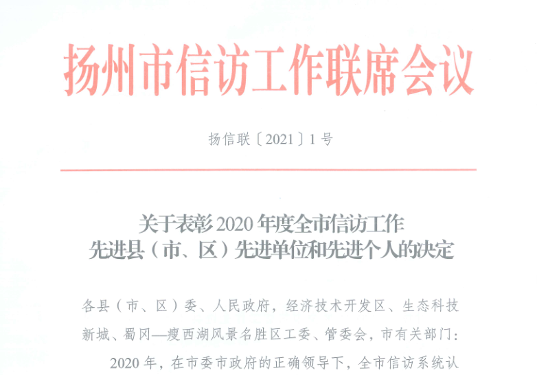 近日,揚州市信訪工作聯(lián)席會議印發(fā)《關(guān)于表彰2020年度全市信訪工作先進縣(市、區(qū))先進單位和先進個人的決定》,揚汽集團汽車東站黨支部書記、副站長張彤獲信訪工作先進個人。