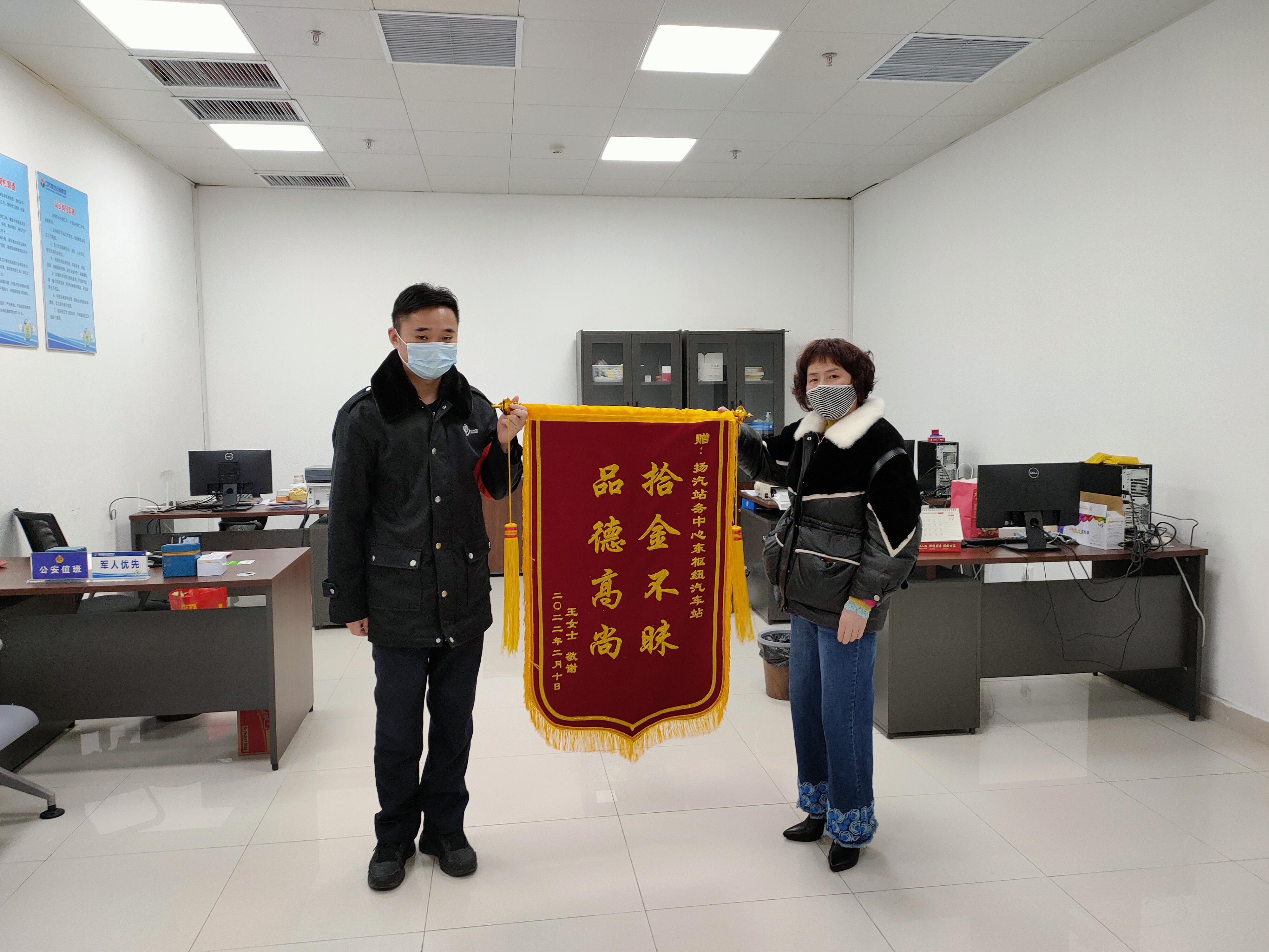 2月8日下午18:00,揚(yáng)州東樞紐汽車站至泰州南站最后一班車即將發(fā)車,臨近發(fā)車點(diǎn),一名旅客匆匆在售票處購(gòu)票后帶著行李上二樓乘車,此時(shí)值班員姜衛(wèi)軍突然接到服務(wù)臺(tái)電話,售票員李玲說道,剛才有名旅客為了趕泰州班車,錢包落在了售票臺(tái)上。姜衛(wèi)軍隨即趕到現(xiàn)場(chǎng),經(jīng)問詢,該班車已準(zhǔn)點(diǎn)駛出車站,在與駐站民警溝通后,確認(rèn)錢包內(nèi)裝有3000元現(xiàn)金、社?般y行卡若干,為消除旅客的焦慮情緒,姜衛(wèi)軍也是第一時(shí)間與王女士取得聯(lián)系。