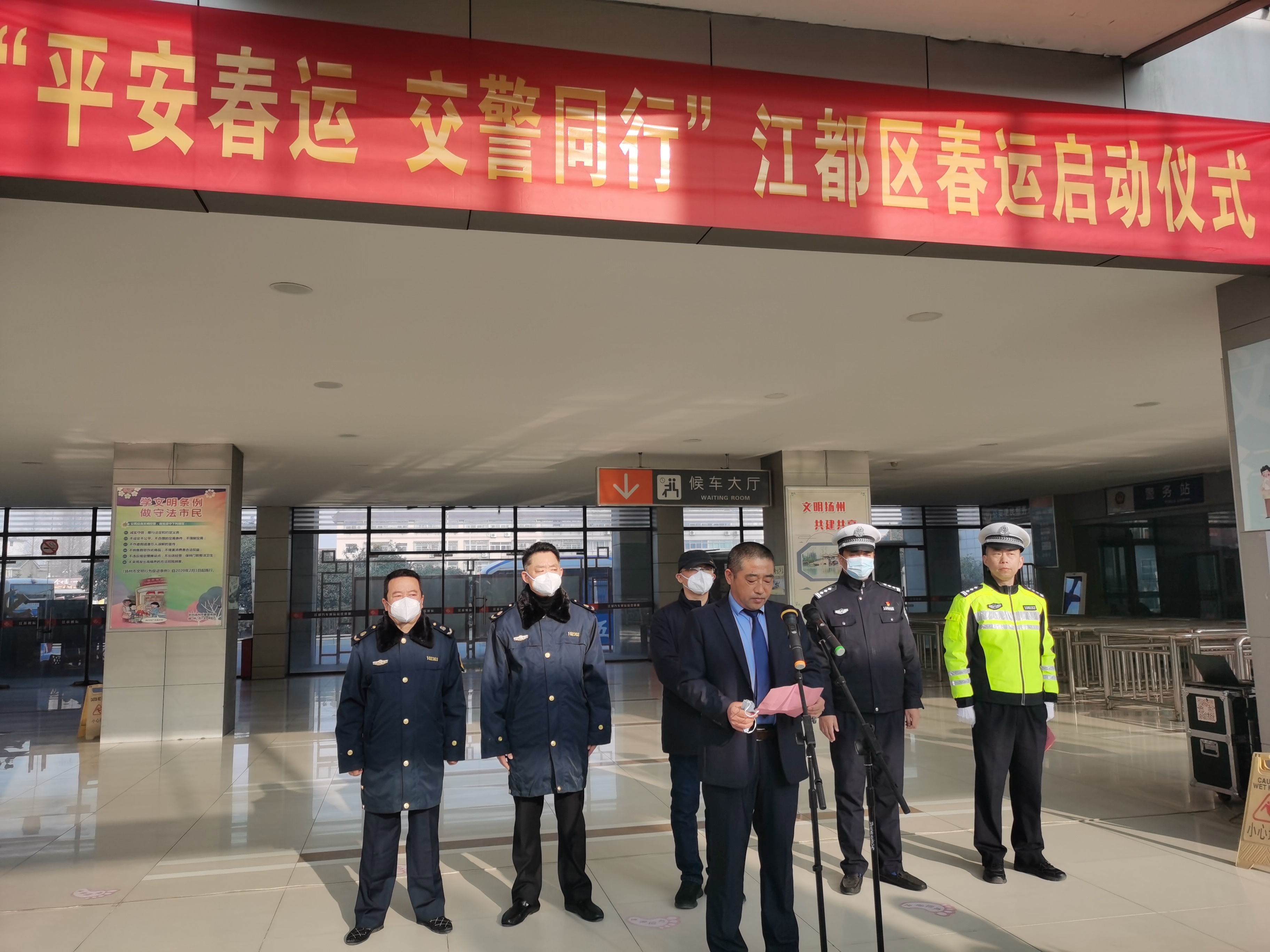 1月7日,2023年“平安春運(yùn) 交警同行”啟動儀式在江都汽車客運(yùn)站售票大廳內(nèi)舉行。江都區(qū)公安局副局長、交警大隊大隊長宦新宇,江都區(qū)交警大隊車管所所長滕斌,揚(yáng)汽集團(tuán)相關(guān)負(fù)責(zé)人參加活動。